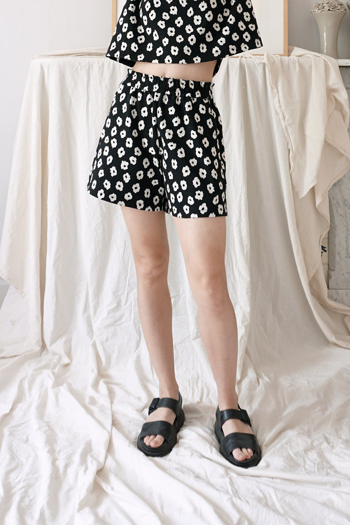 Easy elastic-waist shorts cut from thick jacquard jersey in a wonky fleur print. Featuring inseam pockets with a hem hitting mid thigh.