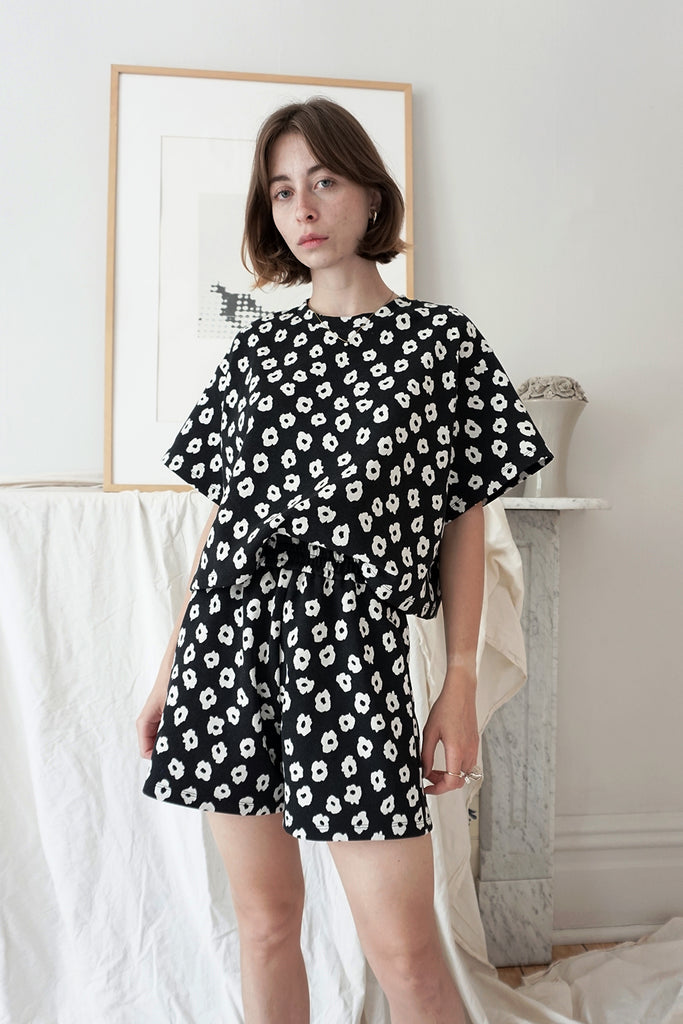 Billy is a lightly cropped, oversized t-shirt with wide, short sleeves and a boxy torso. Hem hits at the hip bone. Cut from thick jacquard jersey in a wonky fleur print. This piece has been pre-washed/shrunk.
