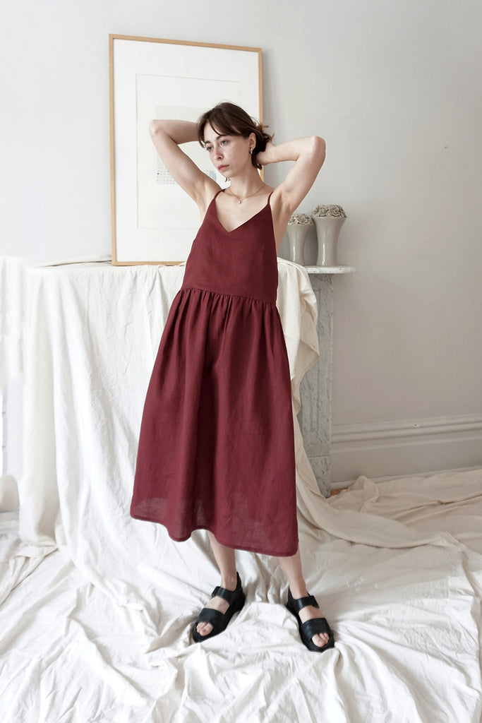 The Delphine Dress is an easy, elegant sundress cut from lightweight washed linen. The wide v-neckline is anchored with adjustable spaghetti straps, flowing to a loose gathered waist and voluminous skirt hemmed below the knee. Featuring in-seam pockets and a self-lined bodice. This dress continues to be a shop favourite year after year.